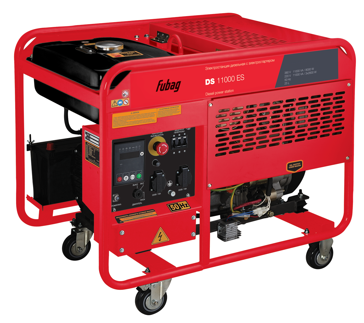 Дизельная трехфазная электростанция максимальной мощностью 11 кВт с надёжным и экономичным двухцилиндровым двигателем FUBAG с возможностью подключения блока автоматического управления. Подходит для обеспечения электроснабжения на производстве, стройплощадке, для питания оборудования 380 В или в качестве надежного резервного источника электроснабжения загородного дома.
