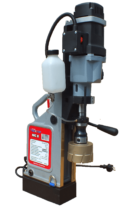 Еще важная отличительная особенность магнитной сверлильной машины так это то, что есть возможность применения корончатого сверла до 110 мм и обычного сверла до 32 мм, а также переносимая возможность магнитного станка делает его незаменимым и идеальным заменителем стационарного станка. За счет своего удобства, простоты, и не менее важно, мобильности, сверлильная машины МС-8 экономит денежные средства организации.