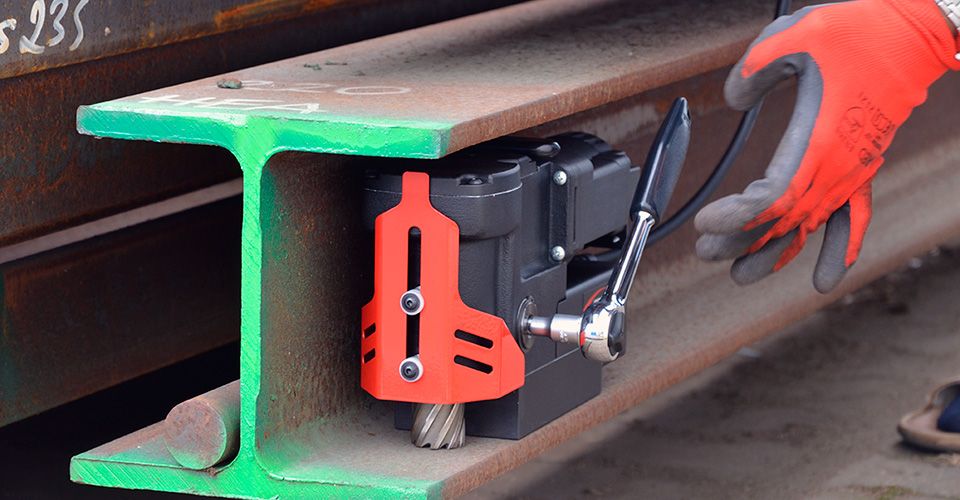 Основной рабочий инструмент – 19 мм кольцевые фрезы под разъём Weldon. Имеет съёмную рукоятку подачи с трещоткой, которая может устанавливаться с обеих сторон. Магнитная сверлильная машина имеет электромагнитное основание с увеличенной силой притяжения к неровным и шероховатым поверхностям (система MFSC), что значительно упрощает работу, тем самым обеспечивая лёгкость и комфортность сверления в самых различных плоскостях. Встроенный защитный кожух. Износостойкие трубчатые направляющие обеспечивают длительный срок службы станка.