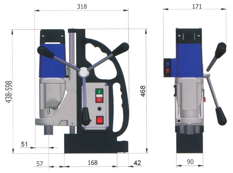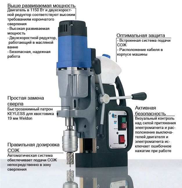Магнитный сверлильный станок MAB 525 SB с поворотным механизмом, который дает возможность поворота магнитного основания до 20º относительно вертикальной оси в обе стороны и до 15 мм по длине для точного позиционирования. МАВ 525 SB – высокофункциональный сверлильный станок на магнитном основании для корончатого сверления Ø до 50 мм и нарезания резьбы до М20 с усиленными направляющими.