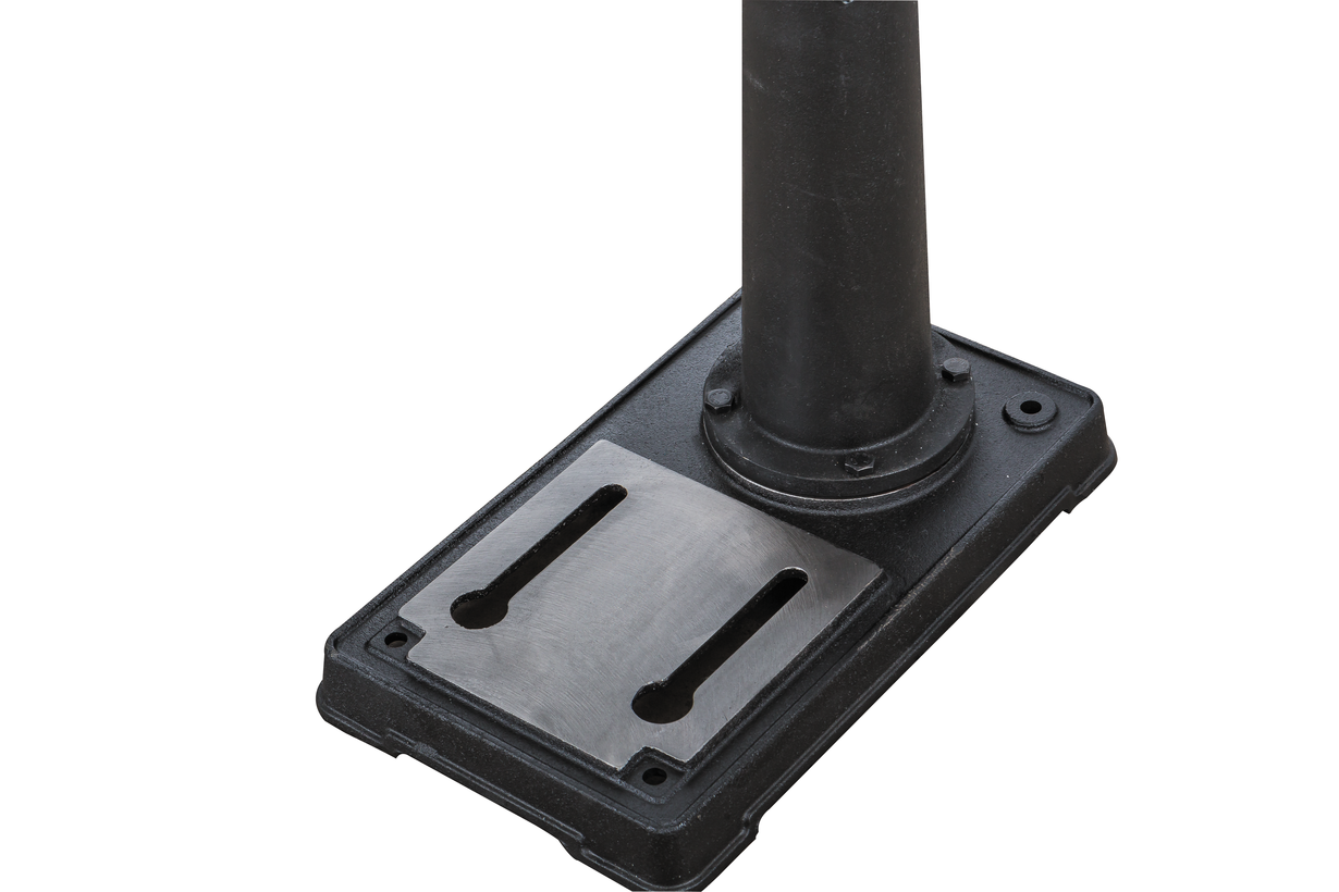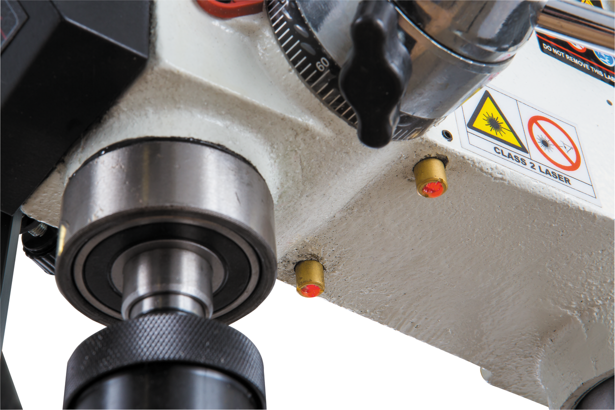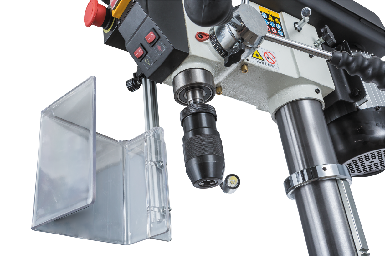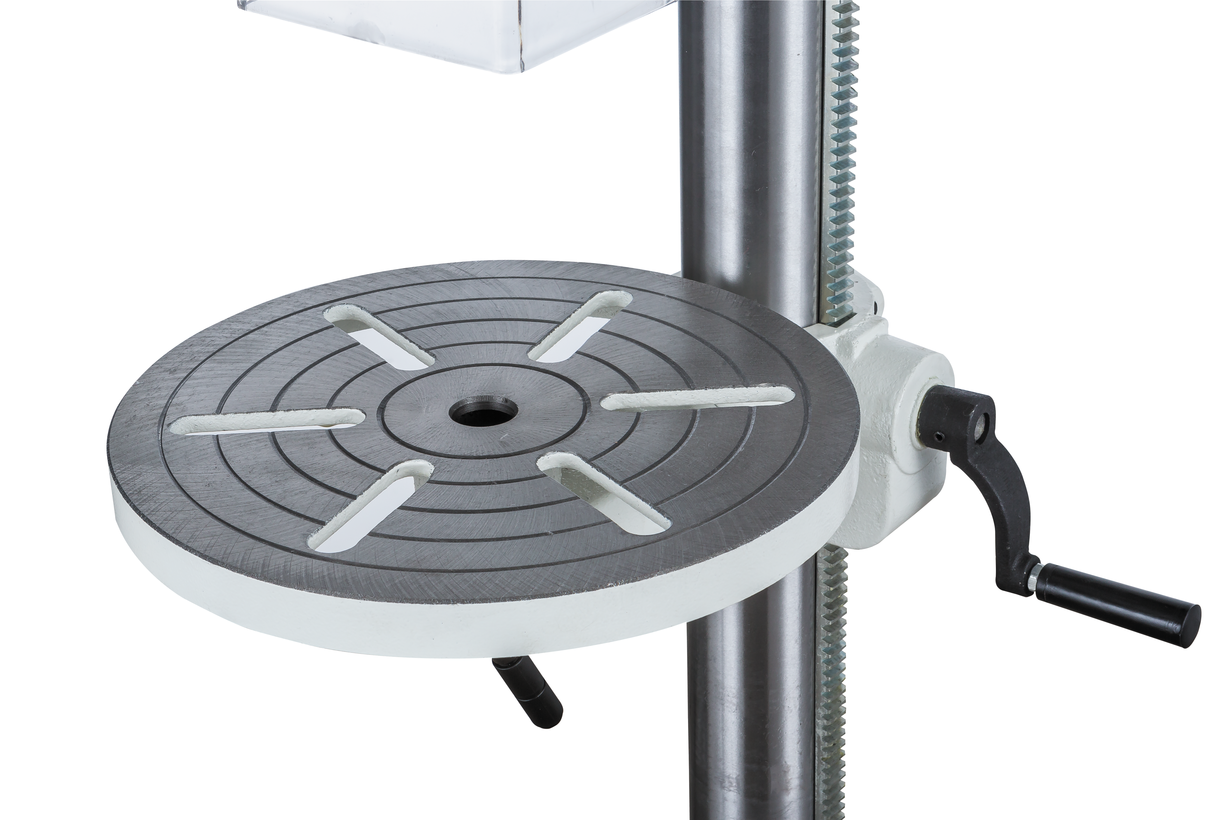 Массивный чугунный стол круглой формы имеет радиальные прорези для установки тисков (поставляются в комплекте) и может вращаться вокруг своей оси. Поворотный кронштейн обеспечивает наклон в обе стороны для сверления под углом и регулируется по высоте при помощи зубчато-реечного механизма. Рабочая область с прорезями есть и на основании станка, что позволяет работать от него, в этом случае расстояние до шпинделя будет достигать 1244 мм. Колонна, кронштейны, стол и прочие образующие конструкцию детали выполнены массивно и прочно, с расчетом на большие усилия при подаче сверла.