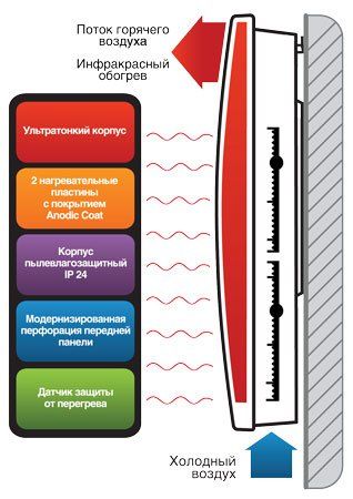 Ступенчатое переключение мощности, автоматический перезапуск, ИК-обогрев, влагозащитное исполнение обогревателя